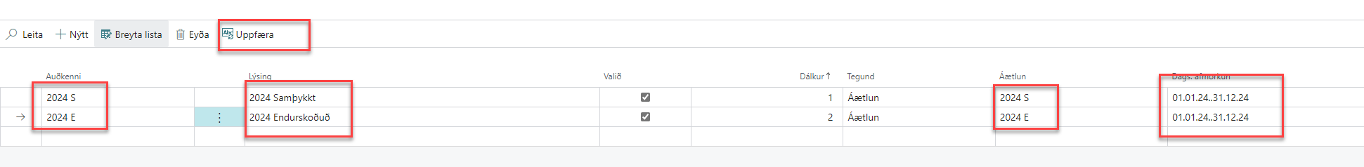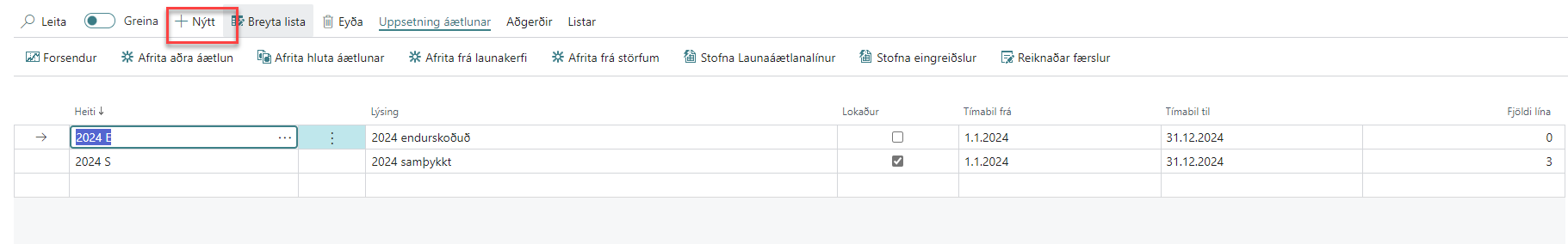 Þá er valið Nýtt og ný áætlun sett í listann, en hún þarf að vera með sama tímabil og samþykkt áætlun
