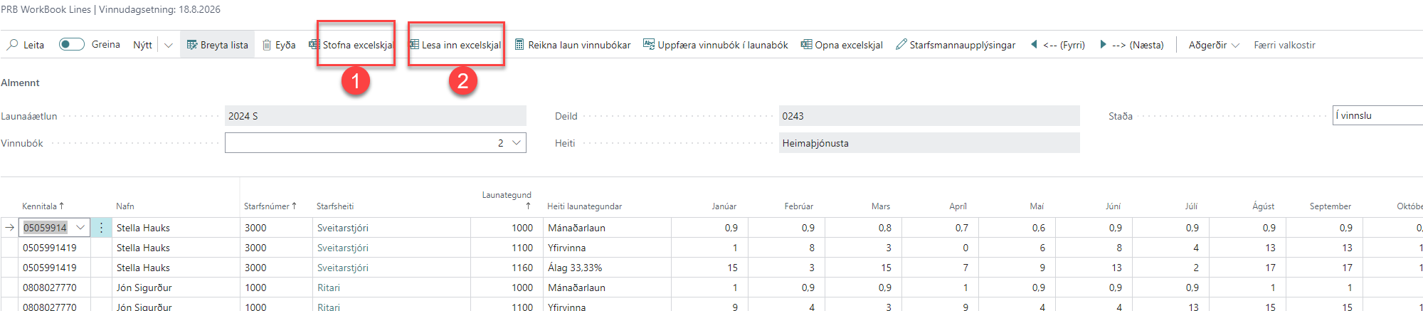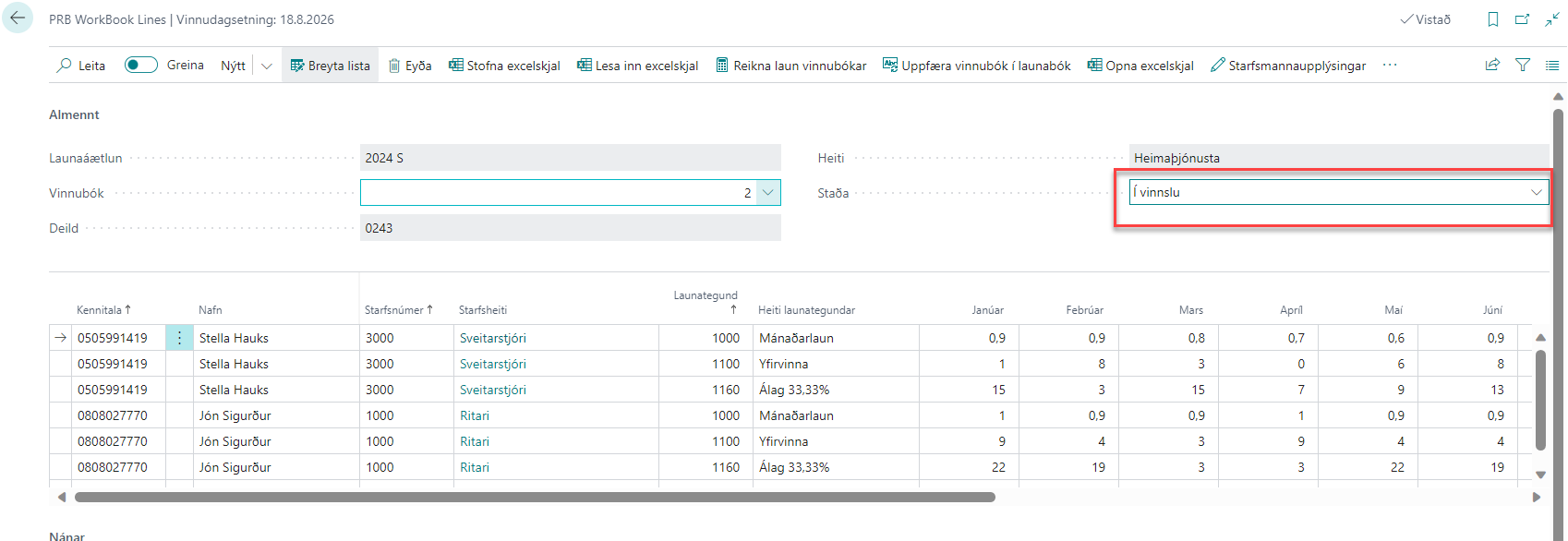Vinnubækur er hægt að senda til stjórnenda bæði á excel formi eða í launaáætlanakerfinu. Þegar vinnubækur eru sendar á excel-formi þarf að passa að skjalinu sé ekki breytt og að eingöngu sé unnið í einingum launaliða eða launaliðum bætt við. Ef uppsetning skjalsins ruglast er ekki hægt að lesa excel-skjalið aftur inn.