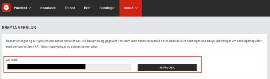Á næstu síðu smellir þú á Sækja Lykil/Klippa lykil. Þennan lykil þarf að líma inn í reitinn API lykill undir Póststoð verslanir fyrir hverja verslun.