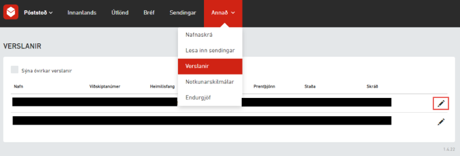 Til að breyta stillingum verslunar í Póststoð, smellir þú á penna hægra megin við verslun