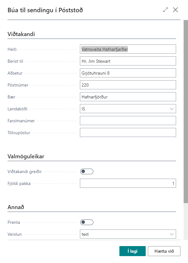 Viðtakandi: Fylla þarf út upplýsingar um viðtakanda sendinga. Sjálfkrafa koma upplýsingar úr sendist-til upplýsingum úr söluskjalinu, en hægt er að breyta þeim áður en sent er á Póststoð í þessum glugga.