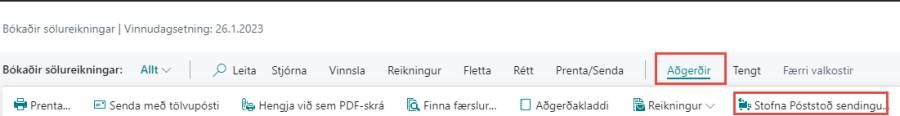 Aðgerðin er einnig í boði í bókuðum sölureikningum ef notandi gleymir að búa til sendingu áður en bókun á sér stað. Þá er hægt að velja Aðgerðir og Stofna Póststoð sendingu.