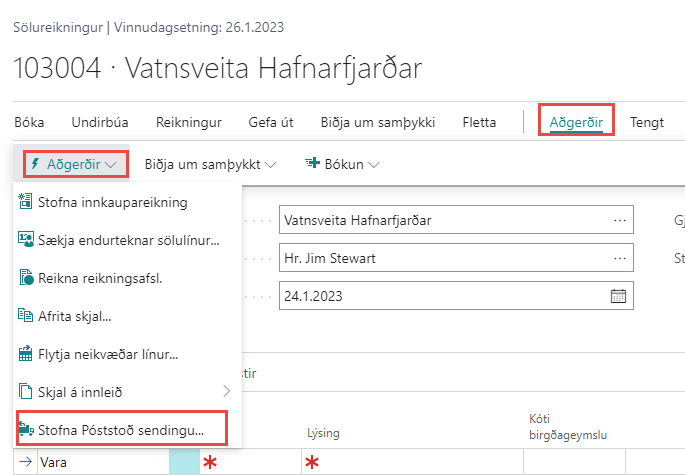 Notandi smellir á Aðgerðir > Aðgerðir og velur Stofna Póststoð sendingu áður en reikningur er bókaður.