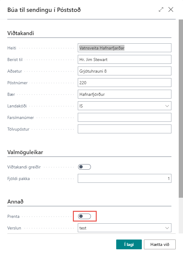 Hægt er að prenta límmiða sendingar í sömu aðgerð og sending er skráð í Póststoð eins og sýnt er hér fyrir neðan. Prentunin á sér ekki stað í gegnum Business Central, heldur sendast upplýsingar um sendinguna í Póststoð client (biðlara) sem Pósturinn úthlutar. Úr því forriti prentast límmiði sendingar. Þetta forrit þarf að vera sett upp á vél notandans.