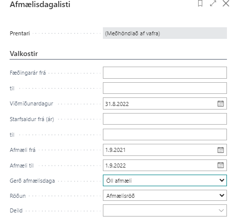 Það er hægt að taka út afmælisdaga fyrir ákveðið tímabil og hægt að velja hvort einungis eru tekin út stórafmæli eða öll afmæli. Skýrslan inniheldur einnig upplýsingar um starfsaldur viðkomandi.