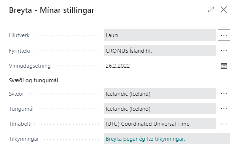 Hlutverk notanda er stillt með því að velja tannhjól efst til hægri og þar Mínar stillingar. Þá kemur upp meðfylgjandi valmynd. Hér skal velja hlutverkið Laun.