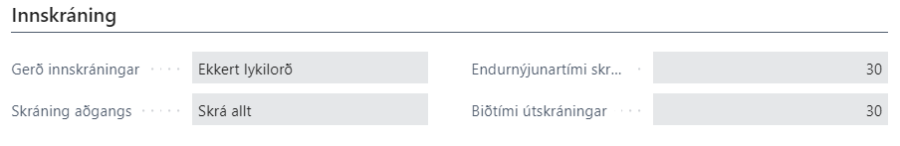 Biðtími útskráningar | Ef notað er lykilorð til þess að skrá sig inn í kerfið er hægt að stilla það þannig að notandinn skráist sjálfkrafa út ef ekki er unnið í kerfinu í ákveðinn tíma. Þessi stilling getur því hjálpað ef notandinn skilur kerfið eftir opið óvart um stundarsakir. |