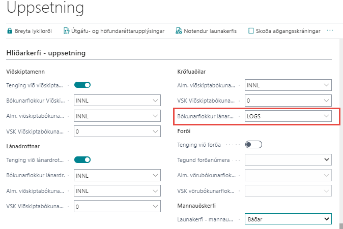 | Lánardrottnar | Haka þarf við tengingu til þess að koma henni á. En auk þess er hægt að skilgreina bókunarflokk, almennan viðskiptabókunarflokk og VSK viðskiptabókunarflokk sem er þá sjálfgefinn ef launamaður er stofnaður sem lánardrottinn beint af starfsmannaspjaldi. |