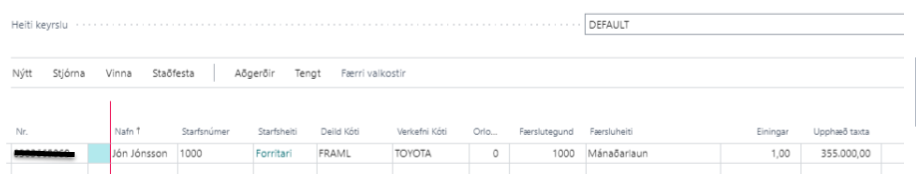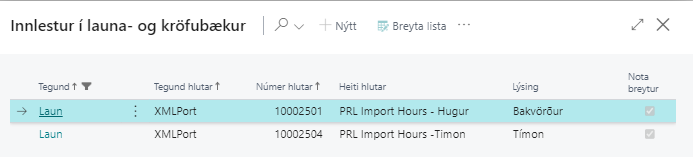 Þarfnast líklega ekki frekari skýringa. Hægt er að skrá kennitölu EÐA nafn (byrjun á því er nóg) í reitinn Nr. þegar launaliðir eru handslegnir í launabók. Gott er að muna eftir því að fela þá reiti sem maður þarf ekki að nota til þess að fækka ásláttum við skráningu.Innlestur: