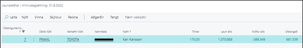 Til þessa að yfirfara launaseðla í útborgun ef valinn liðurinn Launaseðlar á valblaðinu. Þá opnast listi yfir launaseðlana í útborguninni og hægt er að skoða þá nánar og breyta þeim ef þarf.