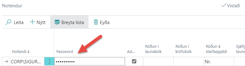 Þetta lykilorð er það lykilorð sem þú notar í hvert sinn sem þú ferð inn í launakerfið. Ef fleiri en einn notandi á að hafa aðgang að launakerfinu er búin til ný lína fyrir neðan þessa með upplýsingum þess notanda.