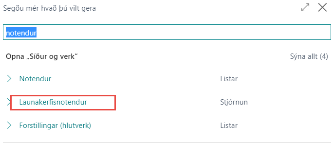 Það sem mikilvægt er að gera strax er að velja lykilorð á launanotandann. Það er gert með því að leita að notendur í leitinni og velja þar Launakerfisnotendur.