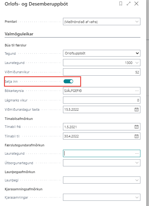 Athugið að til þess að færslur fari í launabók verður að merkja við Setja inn og velja bókarkeyrslu fyrir færslurnar. Myndin er af orlofsuppbót en desemberuppbót er unnin á nákvæmlega sama hátt.