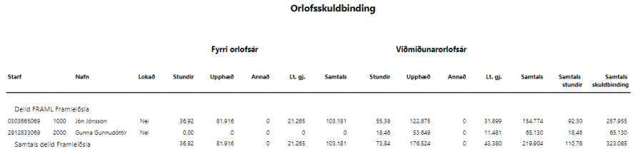Skýrsla sem gefur upplýsingar um orlofsskuldbindingu í tímum og krónum.