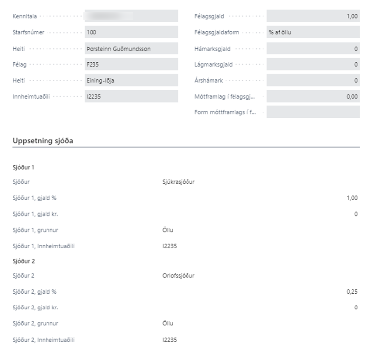 Ef smellt er á kóða stéttarfélags kemur upp skilgreining viðkomandi stéttarfélags. Þar er hægt að breyta uppsetningunni EF hún á að víkja frá staðlaðri uppsetningu félagsins. Athugið að það er hægt að merkja á grunnspjaldi viðkomandi stéttarfélags að slíkt sé ekki hægt en þá birtist textinn Uppsetning sjóðs ríkjandi neðst á spjaldinu.