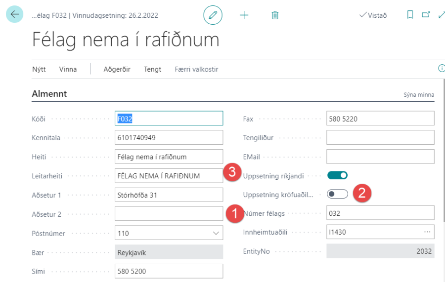 Númer félags | Númer félagsins sjálfs. Þriggja stafa númer stéttarfélaga sem Hagstofan úthlutar og gegna nokkru hlutverki í kjararannsóknum. Stýrir því hvaða innheimtuaðili er sóttur á félagið ef rafræn skil eru í boði. |