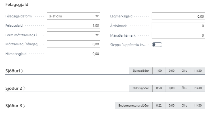 Uppsetning félagsgjalds og sjóða | Félagsgjald er sett upp neðar á spjaldinu og sjóðir sömuleiðis. |