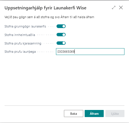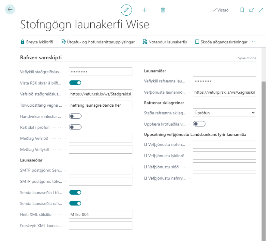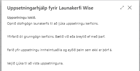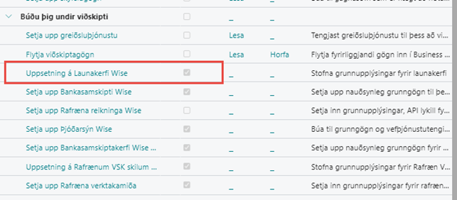 Hér á eftir fara upplýsingar um hvernig Launakerfi Wise er sett upp í Business Central. Ítarlegri upplýsingar um uppsetningu einstakra kerfishluta er að finna í handbók kerfisins.