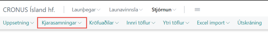 Virkur samningur opnar spjald núgildandi kjarasamnings. Spjald samnings opnar þann samning sem valinn er í listanum fyrir neðan. Einnig er vert að athuga að tímar í mánuði og tímar á dag þurfa hlutfallslega að fara saman. Þær upplýsingar eru fáanlegar hjá viðkomandi félagi. (Sjá lið 1 á mynd hér að neðan).