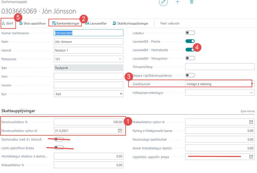 Á starfsmannaspjaldinu eru settar inn skattaupplýsingar (1) , bankaupplýsingar (2), upplýsingar um greiðslumáta (3) og birtingu launaseðla (4).