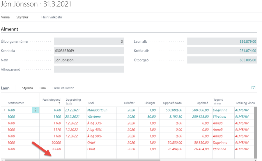 Hér er síðan hægt að opna launaseðla og bæta inn á þá og lagfæra eftir þörfum. Það er ekki nauðsynlegt að gera allt í gegn um launabækur og kröfubækur og oft þægilegt að breyta beint á seðlinum ef um smávægileg mál er að ræða.
