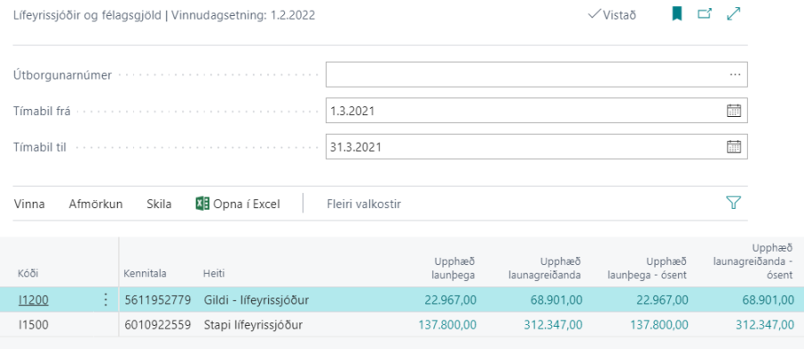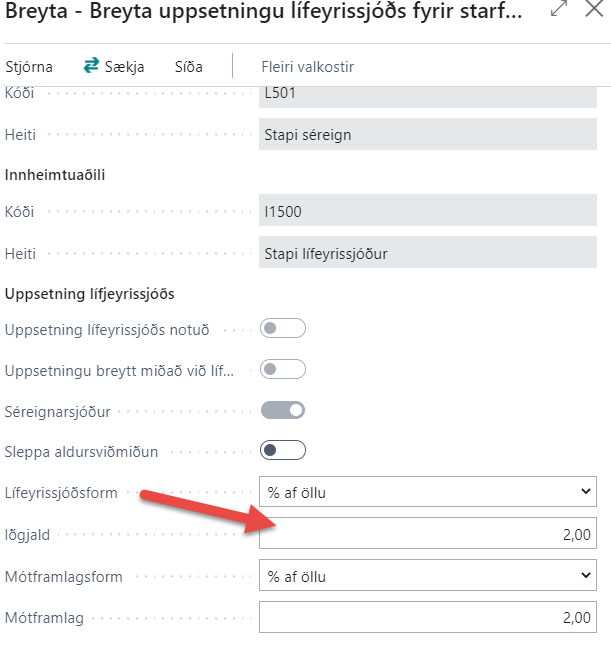 Hér eru skilgreindir þeir lífeyrissjóðir sem greiða á til vegna starfsins. Ef frávik eru frá staðlaðri uppsetningu t.d. vegna séreignarsjóðs er smellt á Vinna og þar Spjald á borðanum og nýjar forsendur vegna tiltekins starfsmanns settar inn. Kemur þá sjálfkrafa hak í reitinn Breytt.