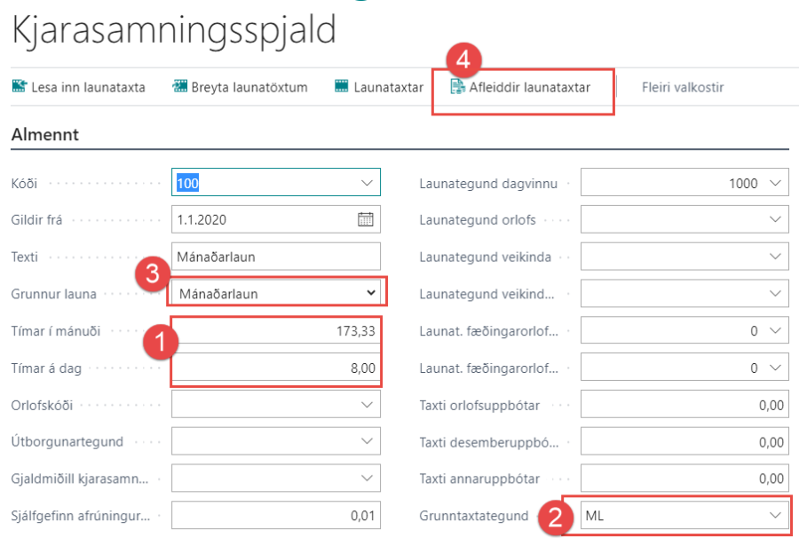 Þeir taxtar sem launþegar fá greitt eftir samkvæmt samningnum. Dagvinna, yfirvinna, álag, stórhátíðarkaup og fleira eru taxtar kjarasamnings og eru þeir taxtar sem á að nota settir upp hér. (Sjá lið 4 á mynd).