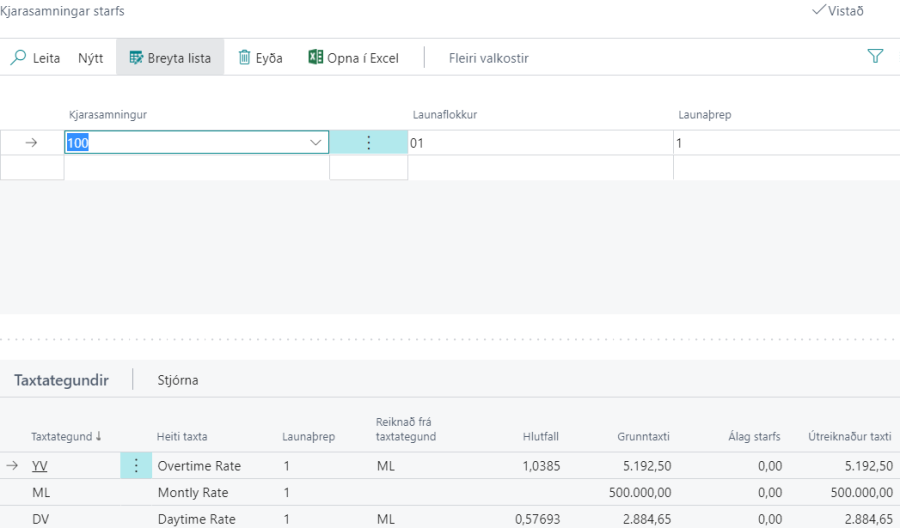 Hér eru launataxtar færðir inn og lagfærðir ef það er gert handvirkt.