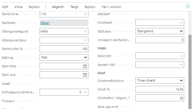 Á hverri útborgunartegund er skilgreind færslubók og eðlilegt er að skilgreina númeraraðir á færslubækurnar. Ef það er ekki gert þá er hægt að setja fylgiskjalsnúmer í þennan reit og kerfið uppfærir hann við hverja bókun.Orlofsútreikningur: