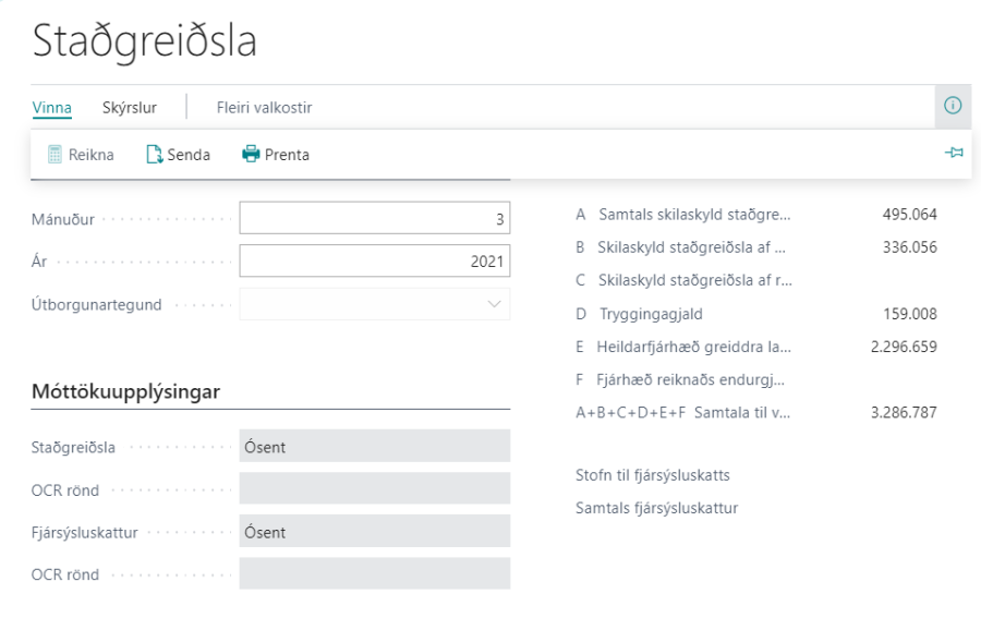 Skil á staðgreiðslu til RSK er unnin hér í einföldum glugga. Eingöngu er valinn mánuður og ár og valið Vinna og þar undir Reikna. Þá birtast út reiknaðar tölur í glugganum. Hægt er að skoða skilagrein fyrir sendingu og sjálfsagt að gera það öðru hvoru til að fullvissa sig um að allar stillingar séu í lagi.