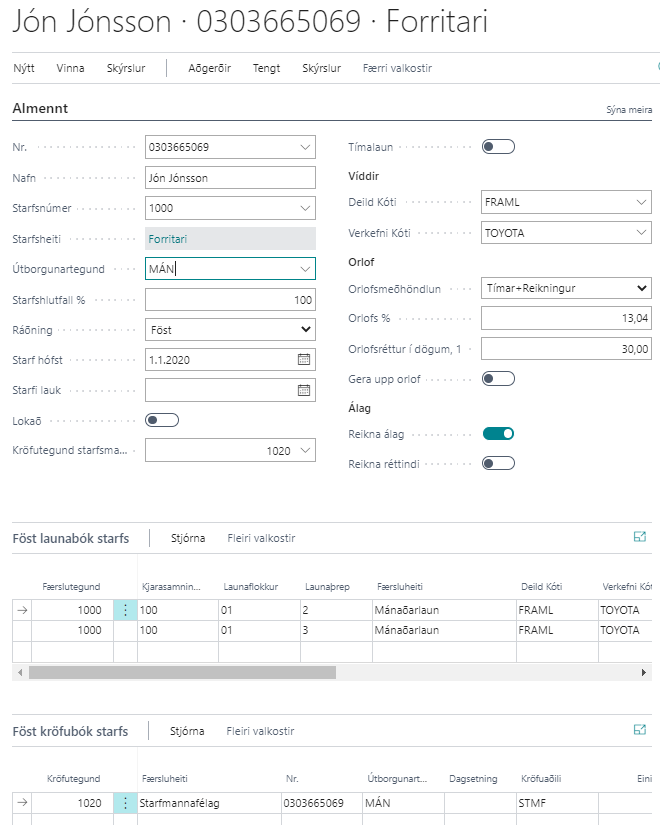 Til að komast á Starfaspjald er valið Störf á aðgerðastikunni á Starfsmannaspjaldinu.