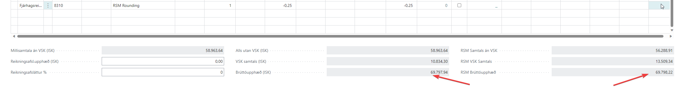 Í eldri útgáfum af RSM gat komið aukalegar RSM rúnunarlínur þegar valið er að hafa kerfið til að bæta við afrúnunar línum við afrúnunum. Þær voru oft án gildis eða gildi sem skekkti reikningin þetta hefur nú verið lagfært.