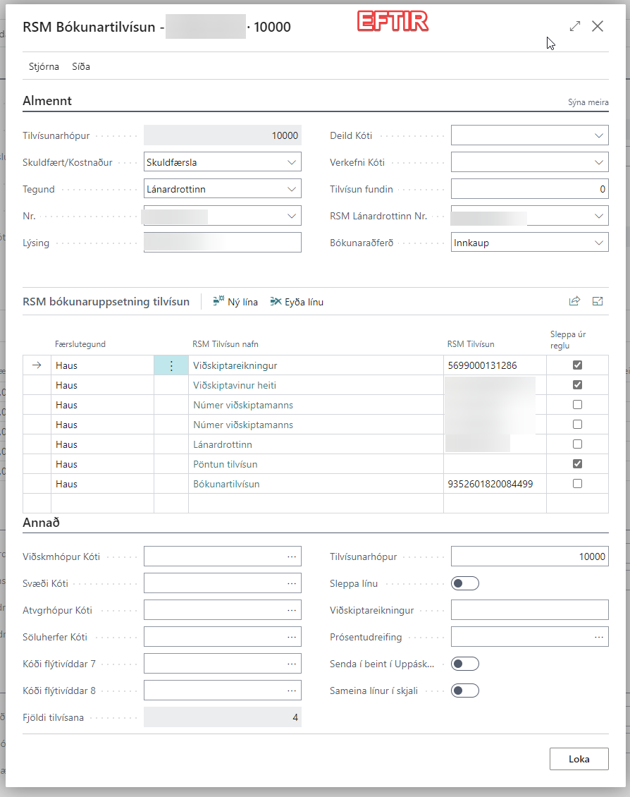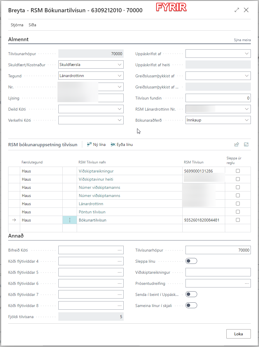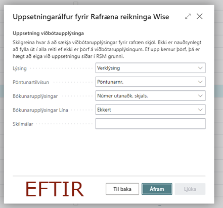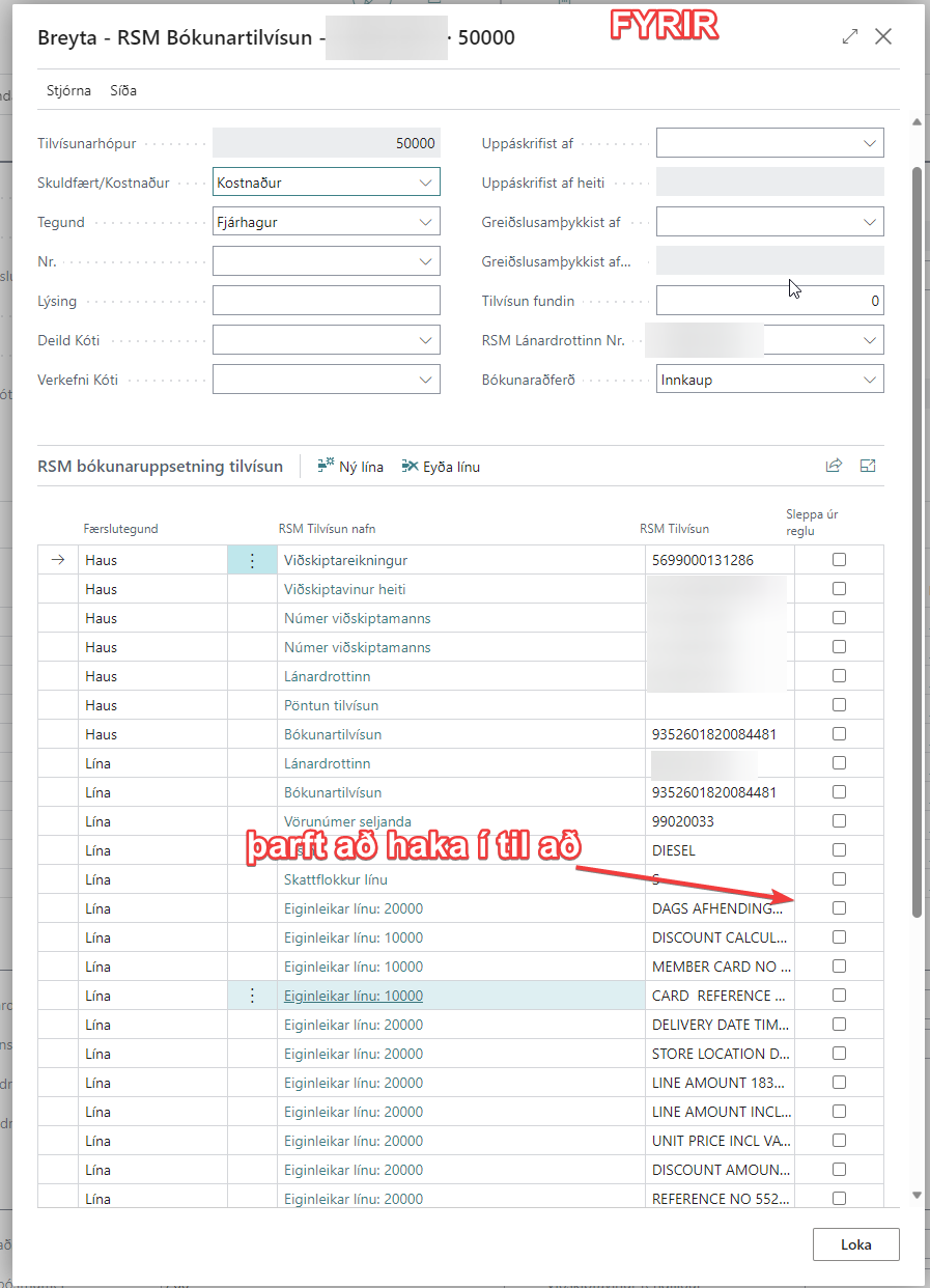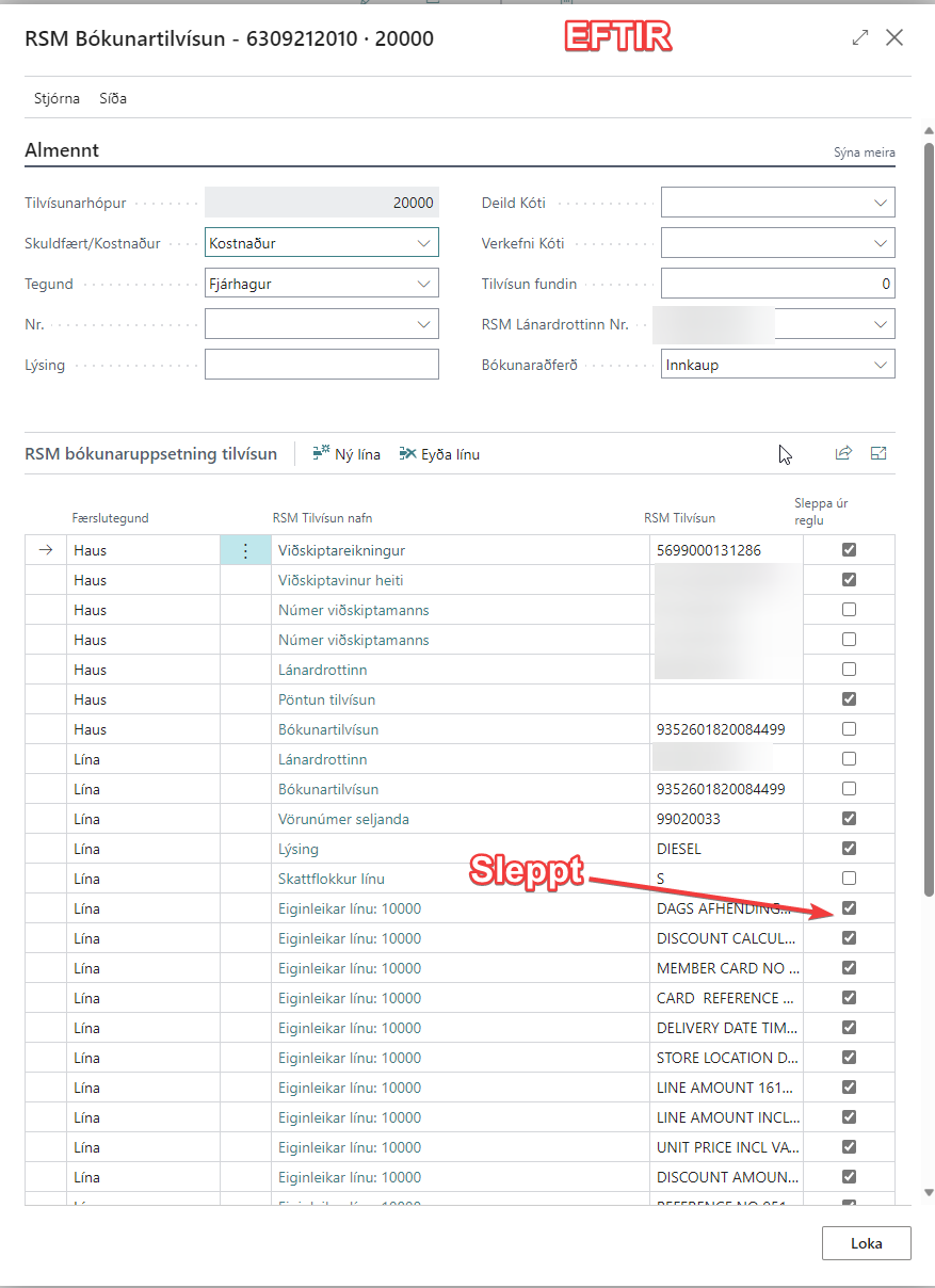 Nú hjálpar kerfið þér við að setja upp bókunartilvísanir í línum. RSM kemur með tillögur að bókunartilvísunum af línum sem henta flestum bókunartilvísunaruppsentingu. Þar er sjálf sleppt úr reglu öllum bókunartilvísunum utan Lánardrottinn, Númer viðskiptamanns, Bókunartilvísun, Skattflokkur línu. Í reikningum þar sem að vörur eru með mikil af eiginleikum gat það verið mikil vinna að haka í að sleppa úr reglu oft eða að setja upp bókunarstýringar.