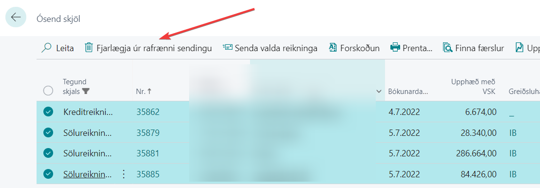Fyrir aðila sem vinna með marga reikninga getur stundum komið til að það verði að taka marga reikninga úr skeytasendingu í einu. Áður fyrr var eingöngu mögulegt að fjarlægja eitt skeyti í einu úr rafrænni sendingu. Nú er mögulegt að fjarlægja marga reikninga í einu úr rafrænni sendingu, með því að velja marga reikninga og smella svo á Fjarlægja úr rafrænni sendingu.