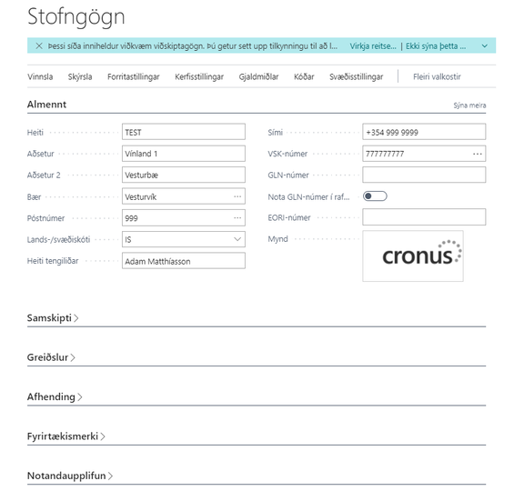 Til þess að finna Stofngögn fyrirtækis er farið í tannhjólið efst í horninu hægra megin og valið Upplýsingar um fyrirtækið eða farið í leitargluggann (Alt+Q) og leitað eftir stofngögn. Þar eru settar inn allar stofnupplýsingar um fyrirtækið sem á bókhaldið. Margar skýrslur í BC sækja hingað upplýsingar og mikilvægt að hafa upplýsingar hér uppfærðar og réttar.