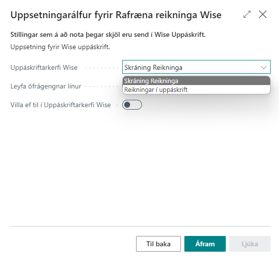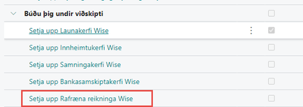 Til að byrja með þarf að setja Rafræna reikninga Wise upp í Business Central. Ef þú ert að nota Cronus B fyrirtækið þá er Wise búið að setja upp Rafræna reikninga Wise fyrir þig og þú þarft ekki að keyra álf.