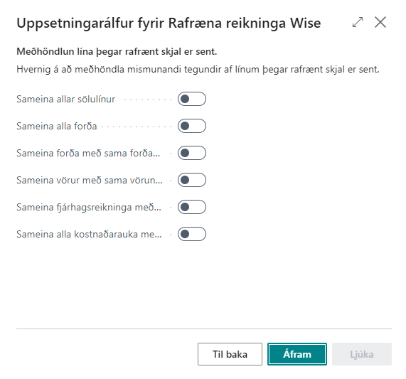Skref 3. Val um hvort sameina eigi línur á sölureikningum. Þessum upplýsingum er alltaf hægt að breyta eftir á.