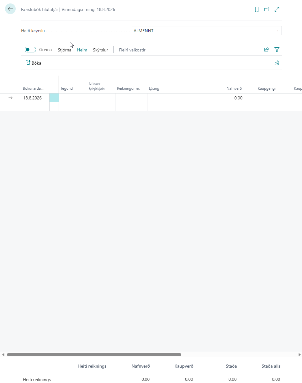 Til að finna færslubók hlutafjár er farið í Hluthafar - Færslubók hlutafjár. Þarna er að finna færslubækur, fyrir handvirkar og vélrænar færslur. Þegar arður er reiknaður færist það einnig inn í bókarkeyrslu.