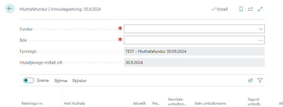 Þetta er hægt að gera beint frá Hluthafafundur með því að fara inn í Bók og stofna þaðan.