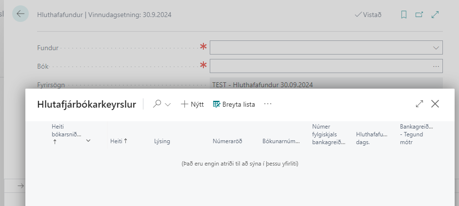 Fyrst er stofnuð bók sem gefið er heitið FUNDUR eða annað lýsandi nafn og henni gefið hak í Er fundarsniðmát. Fundardagsetning er slegin inn og lýsing á fundi, t.d. Aðalfundur xxx. Því næst er bókin opnuð og þá er tvennt sem verður að athuga: