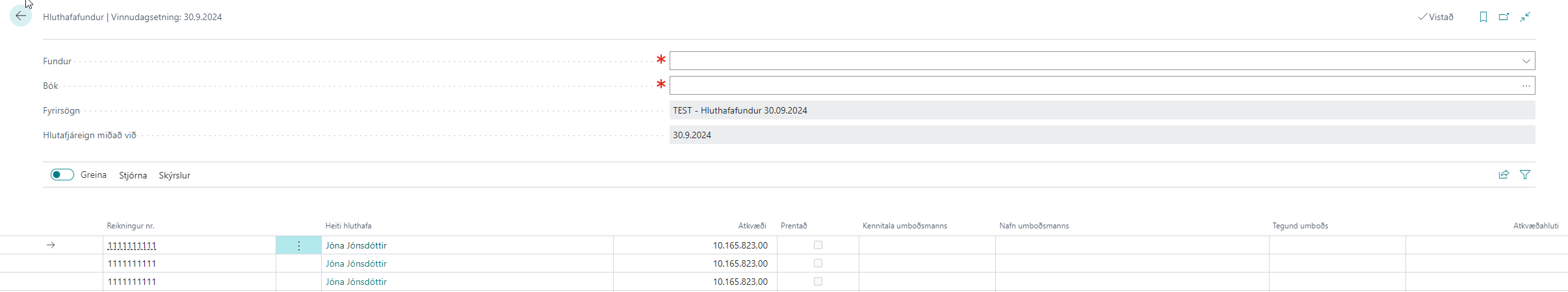 Hluthafafundir - Hluthafafundur. Þessi aðgerð er notuð þegar fundur fer fram. Þá þarf að skrá inn í kerfið þá hluthafa sem mæta á fundinn. Það er gert bæði til að halda utan um mætingu sem og notað ef kjósa þarf í stjórn eða um ákveðin mál.