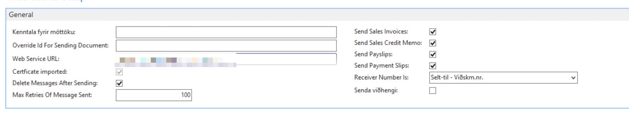 Max Retries of Message Sent: Skal yfirleitt skilið eftir í 100. Segir til um hversu oft er reynt að senda skjalið ef að skjalið lendir á villu.