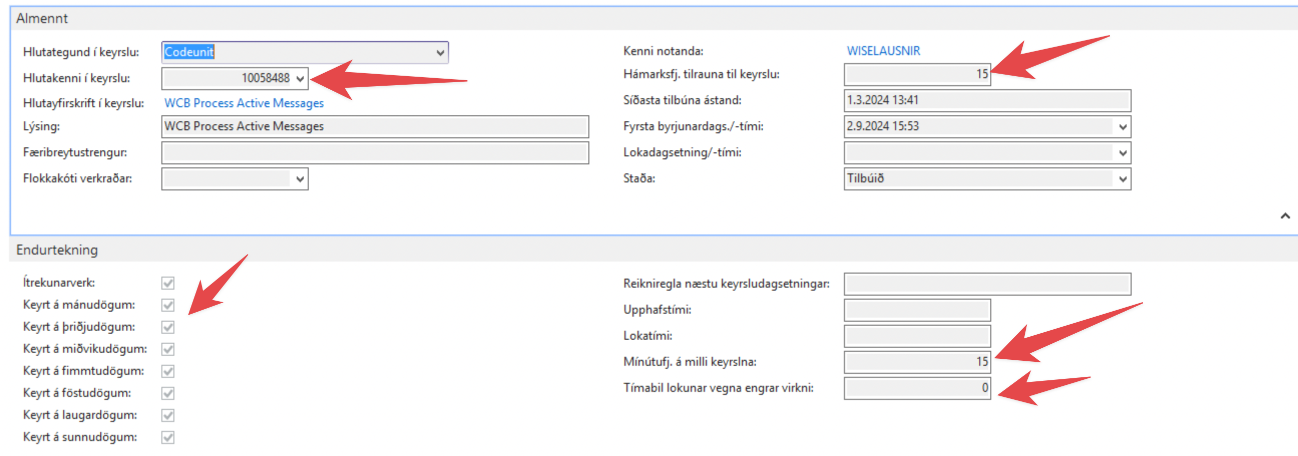 Undir flekanum endurtekning er mælt með að haka við alla keyrsludagana og setja svo Mínútufj. á milli keyrslna í 15. Tímabil lokunar vegna eingrar virkni skal vera 0.