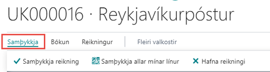Til að samþykkja eina línu velur notandi línuna sem á að samþykkja fer í Stjórna > Samþykkja. Ef notandi vill samþykkja allar línur fer hann í Stjórna > Samþykkja allar mínar línur.