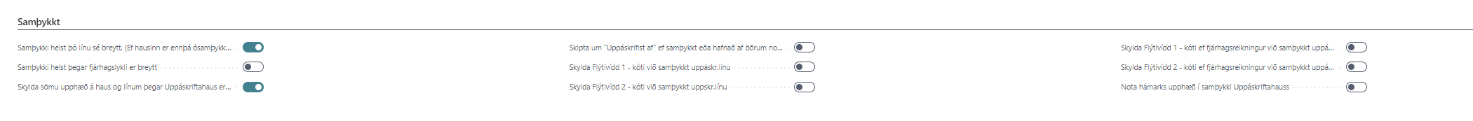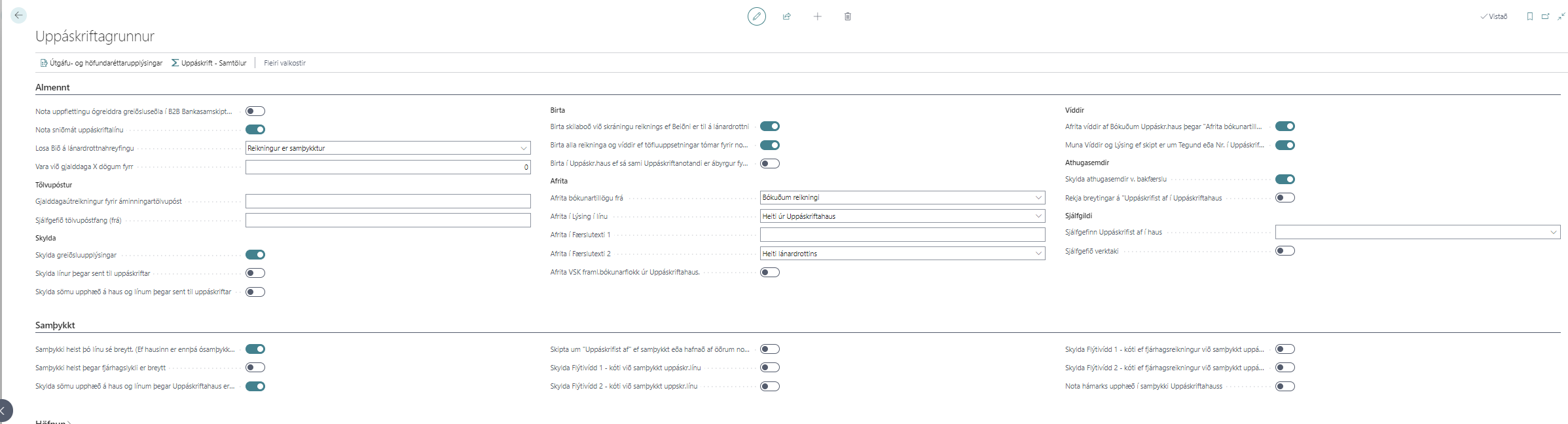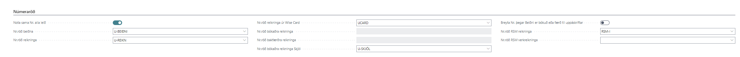 Hér eru settar upp númeraraðir fyrir öll skjöl sem koma úr Uppáskriftarkerfinu. Hægt er að hafa sömu röðina, en það verður að hafa sér númeraröð fyrir bókaða reikninga skjöl, til að þeir haldist aðgreindir frá öllum öðrum stigum ferilsins.
