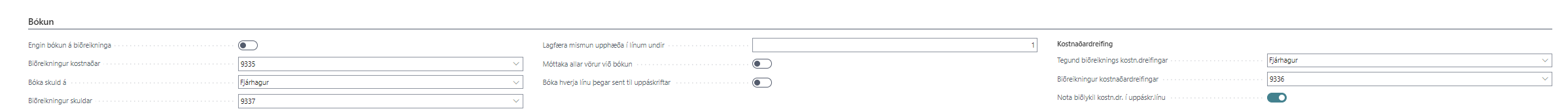 Skylda Flýtivídd 1 og 2 – kóti ef fjárhagsreikningur við samþykkt uppáskr.línu- Hægt að krefjast víddarmerkinga á allar færslur, þá er hakað í þessa reiti.