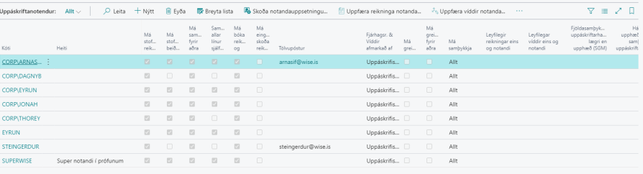 Undir valmöguleikanum Stjórnun > uppáskriftanotendur er stillt upp hvaða notendur hafa heimildir í Uppáskriftarkerfinu og einnig hversu víðtækar þær heimildir eru.