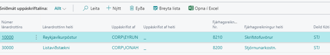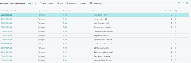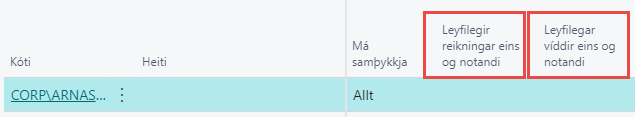 Í þessari valmynd sem hér birtist er stillt upp hvaða reikningum í bókhaldinu uppáskriftaaðilarnir hafa aðgang að. Hægt er að fylla út með því að velja nýtt og velja úr lista nýtt, velja uppáskriftarnotanda, setja inn tegund reiknings og sækja svo viðkomandi reikning. Eða velja nýtt og velja stofna reikning. Hægt að endurtaka fyrir hvern notanda.