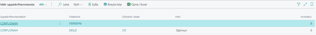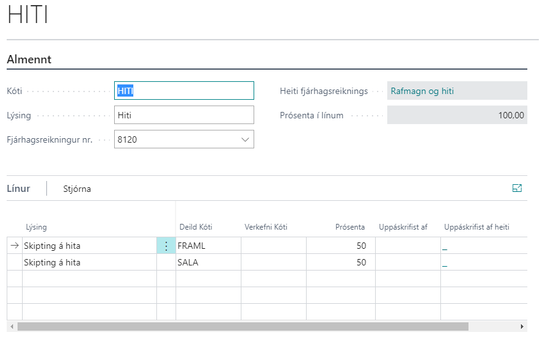 Í línurnar er svo slegið inn deildirnar, samþykkjendur og prósenta fyrir hverja línu, þangað til 100% hefur verið náð í haus.