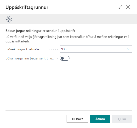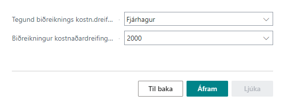 Ef valið er að virkja kostnaðardreifingu þá þarf að velja hvaða reikningur á að vera biðreikningur kostnaðardreifingar ef ekki er valið að virkja þá er ýtt á áfram.